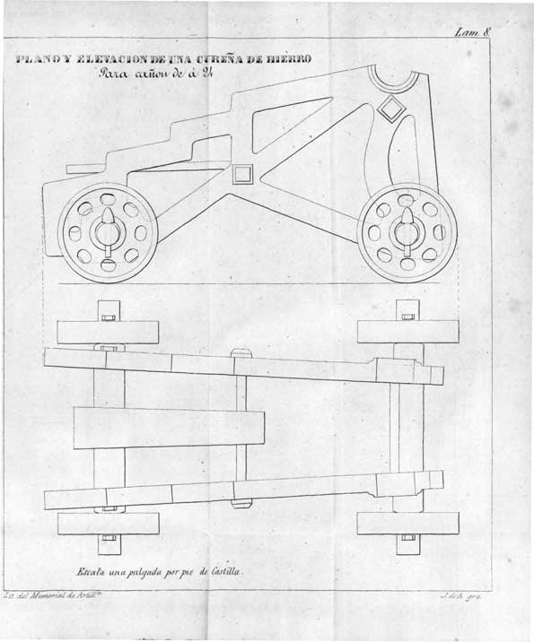 Cureña metálica para cañón de a 24. Lámina que muestra el perfil y alzado de una cureña metálica para cañón de a 24 libras fabricada a partir del año 1849. Está formada por dos gualderas esqueleto, de tres escalones, unidas por tres teleras. En la parte superior las muñoneras, y todo el conjunto montado sobre dos ejes con ruedas también metálicas. Entre las dos gualderas hay una meseta para la cuña de puntería en elevación. |