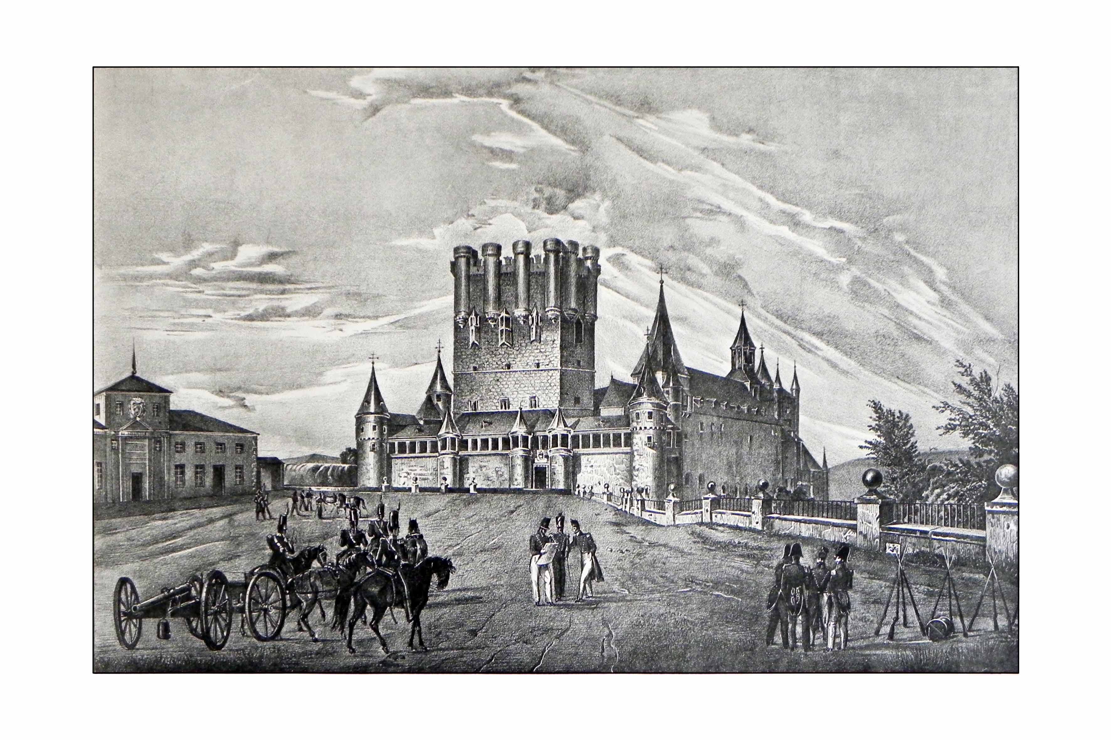 Multimedia “Alcázar de Segovia”. Primera sede del Real Colegio de Artillería desde 1764, año en que se inaugura, hasta el 6 de marzo de 1862, cuando un incendio lo destruye y obliga a alumnos y profesores a trasladarse a su actual sede del antiguo convento de San Francisco, reanudando las clases al día siguiente. En la primera imagen podemos ver la reproducción de una litografía en la que se aprecia una vista general anterior al incendio, obra de la imprenta del Real Museo de Artillería y titulada “Perspectiva de la fachada principal del Real Alcázar de Segovia”. El resto de las imágenes, cedidas gentilmente por Eva Martín Luengo, presentan el estado actual del Alcázar, monumento histórico nacional, visitable durante todo el año[1]. [1] Puede obtenerse más información sobre el Alcázar de Segovia en www.alcazardesegovia.com |